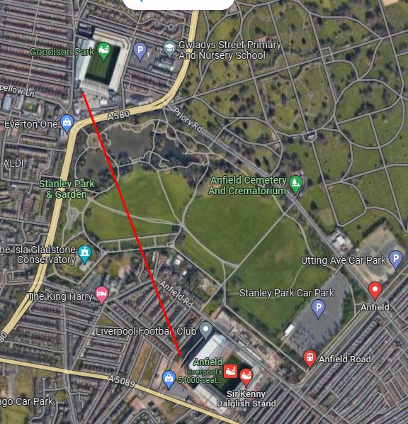 Distanța dintre ”Anfield Road”, stadionul lui Liverpool și ”Goodison Park”, stadionul lui Everton este mai mică de 1 km. și jumătate