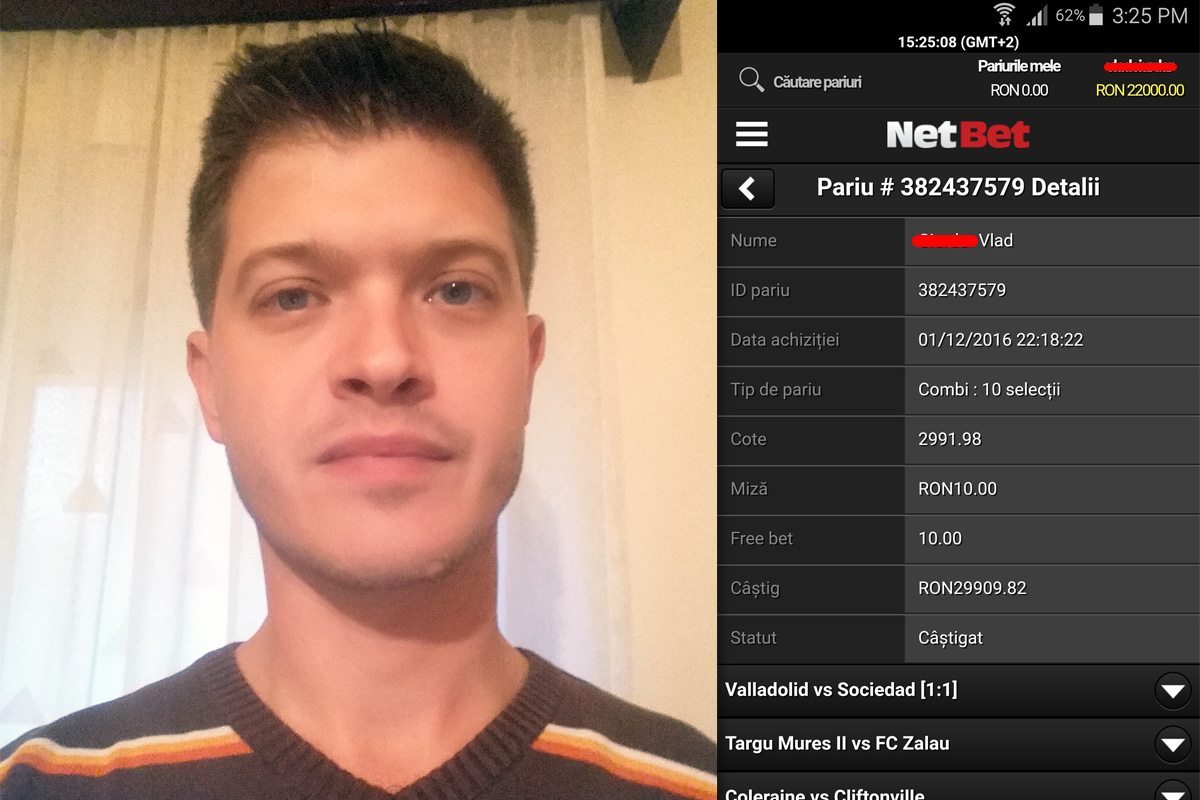 Vlad C. este un foarte fericit parior român. De ziua națională, Vlad a primit cadou un freebet de 10 lei din partea agentiei NetBet și cu el și-a încercat norocul, pariind pe un combi cu 10 meciuri alese fără să stea prea mult pe gânduri. Cota finală? 2992. Nimic ciudat până aici. Cam toți care au jucat la pariuri vreodată au jucat și un bilet fantastic. Diferența este că lui Vlad chiar i-a ieșit!