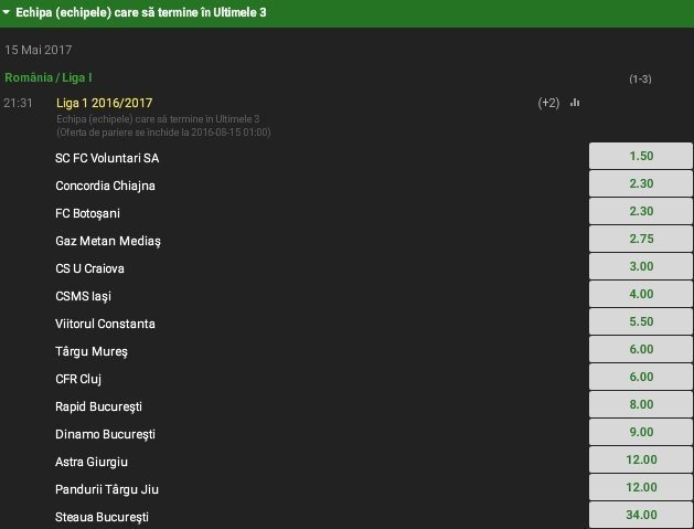 Bookmakerii pregatesc deja stagiunea 2016/2017 de Liga 1. Cotele pentru castigarea campionatului au fost publicate inca de saptamana trecuta, acum casele de pariuri propunandu-ne si cotatiile la retrogrdare.