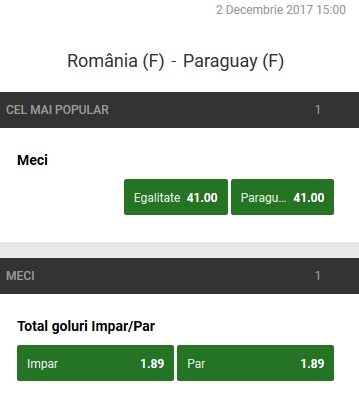 Primul test al Romaniei la Mondial este unul relativ facil. „Tricolorele” vor intalni selectionata din Paraguay, ce este extrem de departe de lumea „buna” a handbalului feminin. Cotele partidei vorbesc de la sine, Romania nefiindu-i atribuita nici macar cota de 1.01.