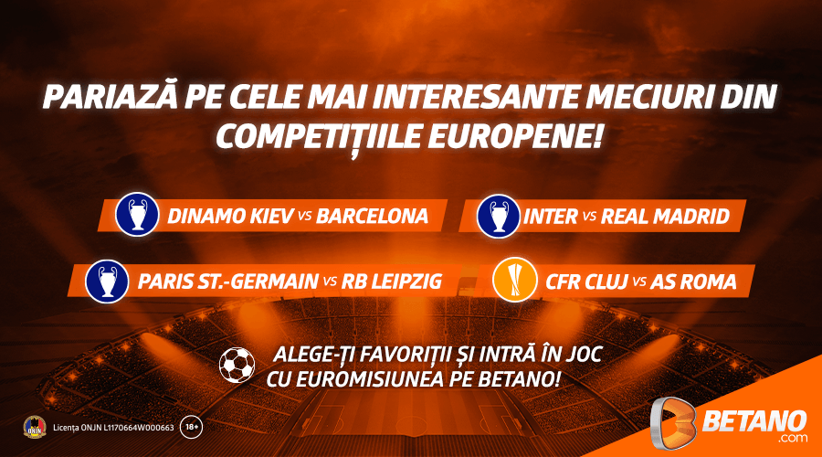 Bucură-te de fotbalul jucat în competițiile europene alături de Betano, unde ai peste 1,500 de pariuri pe fiecare meci, Cash Out 100% înainte de fluierul de start, BetCombo, sute de Pariuri Speciale și o EuroMisiune creată pentru fanii spectacolului de pe dreptunghiul verde, care îti poate aduce un Free Bet!