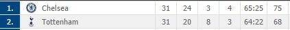 Inaintea rundei cu numarul 31, Chelsea este desprinsa la 7 puncte de principala urmaritoare, Tottenham. Finalul rundei a 32-a ar putea aduce, insa, un anumit echilibru in batalia pentru prima pozitie.