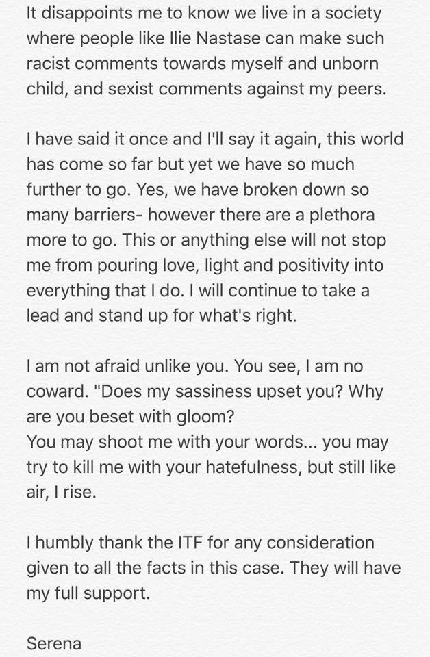 „Sunt dezamagita sa aflu ca traim intr-o societate in care persoane precum Ilie Nastase pot face asemenea comentarii rasiste la adresa mea, a copilului meu nenascut sau comentarii sexiste impotriva colegelor mele. (…) Mie nu mi-e teama, spre deosebire de tine. Vezi, eu nu sunt lasa. Satisfactia mea te deranjeaza? Multumesc Federatiei Internationale de Tenis pentru modul in care au actionat in acest caz. Ei vor avea sprijinul meu total”, a postat Serena Williams.