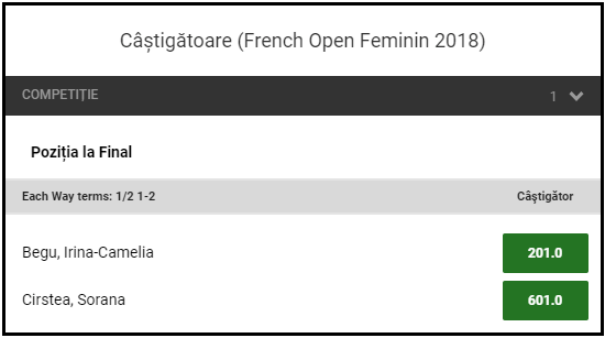 Doua dintre cele mai bine clasate jucatoare ale Romaniei, Irina Begu (38 WTA) si Sorana Cirstea (36 WTA), nu primesc sanse reale din partea bookmaker-ilor pentru un succes la actuala editie a marelui slam de la Paris. Daca Irina este cotata cu 201.0 la Unibet, Sorana are o cota de 3 ori mai mare, 601.0.