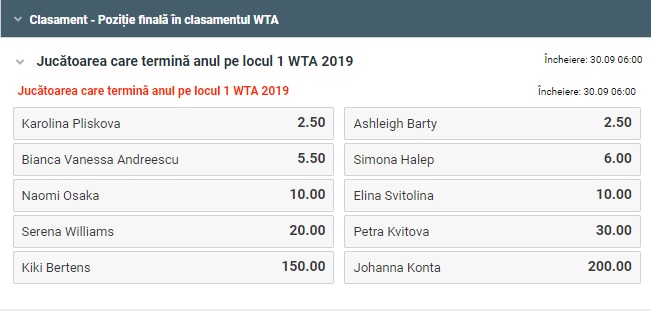 Tenismena Simona Halep, locul 5 WTA in clasamentul live, a primit cota 6.00 sa incheie anul 2019 pe prima pozitie a ierarhiei WTA.