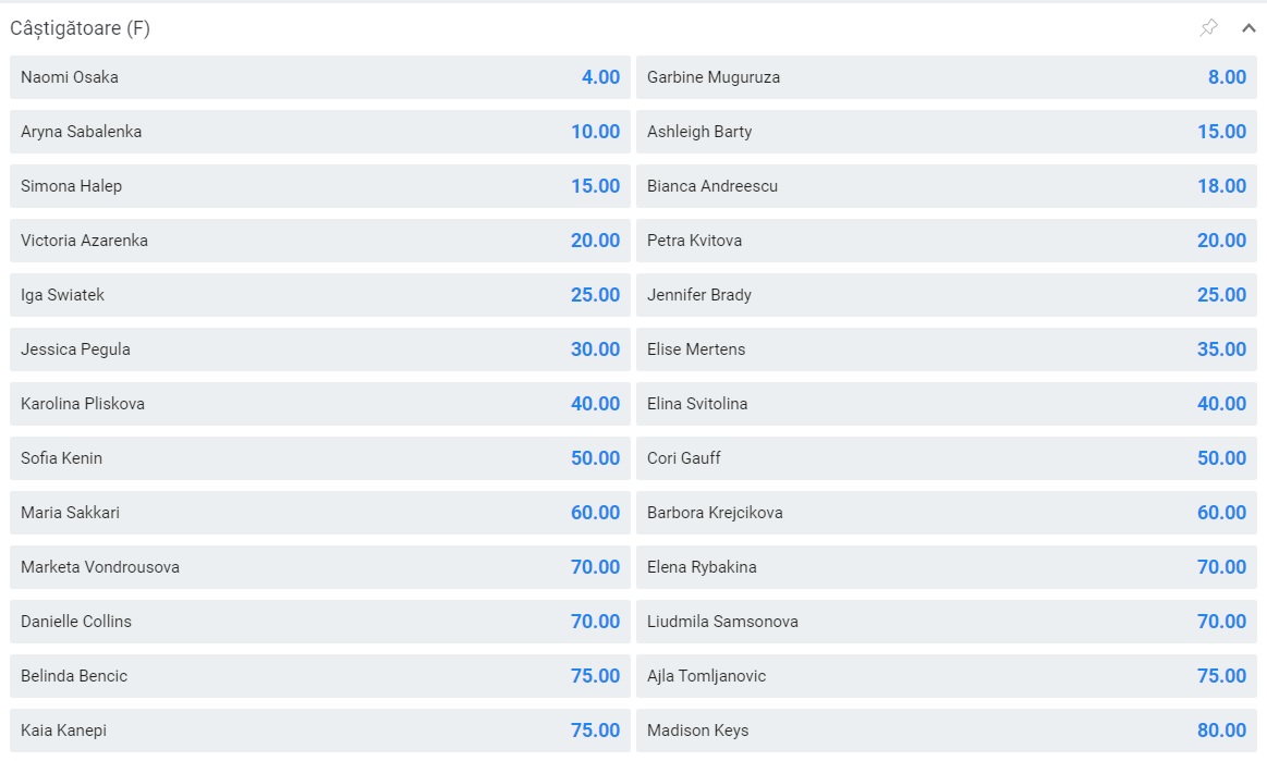 Aryna Sabalenka, una dintre cele mai in forma tenismene din circuitul WTA, este cotata cu 10.00 sa castige al doilea titlu din 2021 chiar la Miami, dupa ce s-a impus la Abu Dhabi, in ianuarie. Garbine Muguruza are cota 8.00 sa triumfe si are toate motivele sa spere la trofeu. Iberica a castigat 18 din cele 22 de meciuri ale sezonului, dupa finale la Yarra Valley Classic, Doha, plus titlu la Dubai. In final, favorita principala este considerata Naomi Osaka (cota 4.00), castigatoarea de la Australian Open, ce totusi nu a trecut niciodata de turul 3 la Miami.