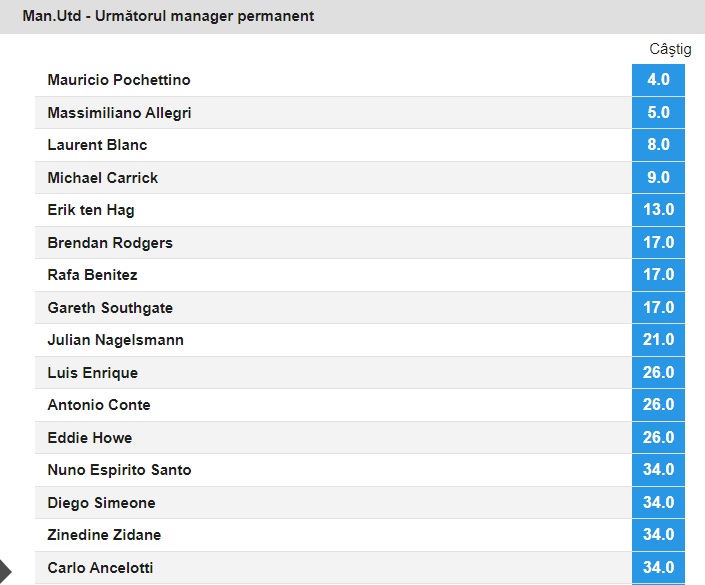Fanii lui United nu il mai sustin pe Ole Gunnar Solskjaer, iar norvegianul este aproape de demitere. Conform presei italiene, in capul listei de inlocuitori s-ar afla Massimiliano Allegri, liber de contract dupa despartirea de Juventus Torino. Italianul are cota 5.00 sa fie numit urmatorul manager permanent al gruparii de pe Old Trafford. Chiar daca Mauricio Pochettino e cotat cu 4.00, este greu de crezut ca va parasi Tottenham in perioada urmatoare. Allegri a cucerit 11 trofee alaturi de Juventus, cu care a jucat si doua finale de Liga Campionilor. Antrenorul italian si-ar fi cumparat deja o casa la Londra si ar urma intensiv cursuri de limba engleza. Consulta si tu toate selectiile, pregateste-ti banii si mizeaza pe cotele de la Betfair!