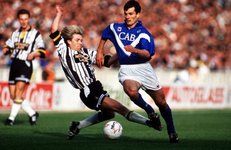 20 MARCH 1994: ANDY LEGG OF NOTTS COUNTY SLIDES IN FOR A TACKLE AS IAON OUIDIU SABAU OF THE ITALIAN SOCCER CLUB BRESCIA RUNS WITH THE BALL. BRESCIA BEAT ENGLISH CLUB NOTTS COUNTY 1-0 IN THE FINAL OF THE ANGLO-ITALIAN CUP AT WEMBLEY TODAY. Mandatory Credit: Anton Want/ALLSPORT
