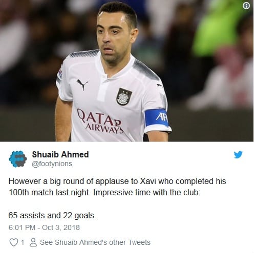 Spaniolul a disputat al 100-lea meci in tricoul qatarezilor de la Al Sadd, in prima mansa a semifinalei Ligii Campionilor Asiei, o infrangere in fata formatiei iraniene Persepolis. Xavi a inregistrat a 65-a pasa decisiva in aceasta partida, o realizare superba, tinand cont de varsta lui si de faptul ca spaniolul nu a fost un mijlocas super-ofensiv. De asemenea, dupa despartirea de Barcelona in 2015, legenda blaugrana a inscris 22 de goluri in toate competitiile pentru Al Sadd. In alta ordine de idei, coechipierul spaniolului, Baghdad Bounedjah este liderul la zi al marcatorilor pentru club si echipa nationala. Atacantul a inscris 40 de goluri in 2018, peste Lionel Messi si Cristiano Ronaldo.