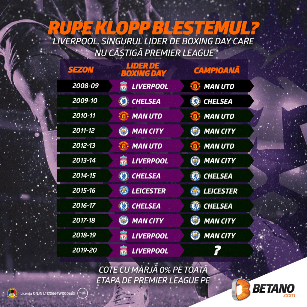 Prima mare ocazie ratată a venit în sezonul 2008/2009, când echipa condusă de Steven Gerrard și Fernando Torres a dat cu piciorul șansei de a câștga coroana și Manchester United i-a luat fața. Apoi, toți liderii de Boxing Day și-au respectat renumele până în 2013/2014, când Liverpool, condusă de Brendan Rodgers, actualul manager al lui Leicester, s-a împiedicat din nou pe final. A profitat Manchester City, echipa care a reușit să-i sufle titlul și anul trecut, într-un sezon în care Liverpool și Jurgen Klopp erau lideri la final de 2018.