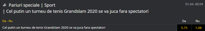 Australian Open este singura intrecere de grand slam care s-a disputat in 2020. Novak Djokovic a trecut in ultimul act de Dominic Thiem si si-a trecut in cont al 8-lea titlu la Melbourne, devenind astfel cel mai de succes jucator din istoria turneului. La eFortuna, cota pentru ca minim un turneu major din 2020 sa fie disputat fara spectatori este una destul de ridicata, casele de pariuri fiind increzatoare ca acest lucru nu se va intampla.