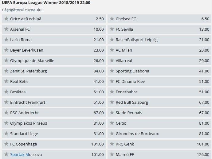Cotele la castigarea Europa League in sezonul 2018-2019