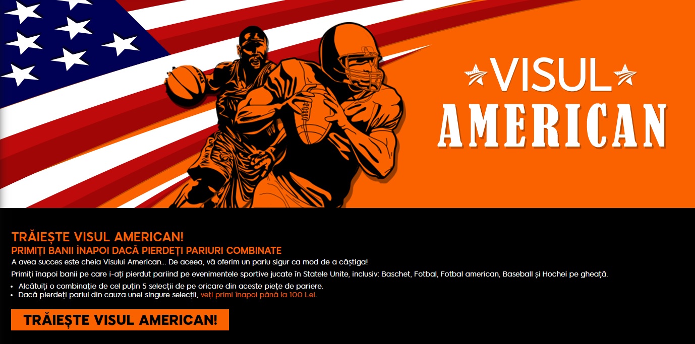 Agentia 888Sport ofera clientilor miza inapoi, pana la 100 de RON, pentru orice bilet de cel putin 5 evenimente, care are un singur meci pierdut. Oferta este disponibila clientilor de pe platforma online, iar noii inegistrati beneficiaza si de un bonus de 1000 de RON! Va puteti deschide cont foarte usor, cu un click AICI.