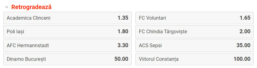 La pariuri cele mai mici șanse de a evita retrogradarea le au Academica Clinceni și FC  Voluntari.
