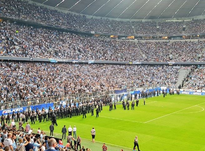 In turul jucat in deplasare, echipa din Munchen a remizat, scor 1-1, si era favorita pentru mentinerea in liga secunda. In retur, s-a produs o surpriza imensa, iar formatia lui Vitor Pereira a pierdut, scor 0-2, si a retrogradat in divizia a 3-a, in fata a 62.200 de oameni prezenti pe Allianz Arena. La final, extrem de suparati, ultrasii lui 1860 Munchen au inceput sa arunce cu obiecte metalice in teren, iar fortele de ordine au format un cordon in fata peluzei pentru a opri o eventuala invadare a gazonului. Inaintea partidei, suporterii au anuntat ca daca echipa lor va retrograda, vor da foc la stadion.